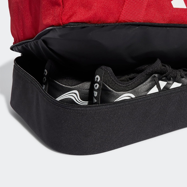 Perfect for storing your gear, this adidas Tiro League duffel bag includes a hard-case bottom compartment for added durability and a side mesh pocket to keep snacks and a water bottle within reach. The padded, adjustable shoulder strap ensures every carry is a comfortable one. The handles make it easy to grab when you’re in a hurry to get to training. Made with a series of recycled materials, and at least 40% recycled content, this product represents just one of our solutions to help end plastic waste.